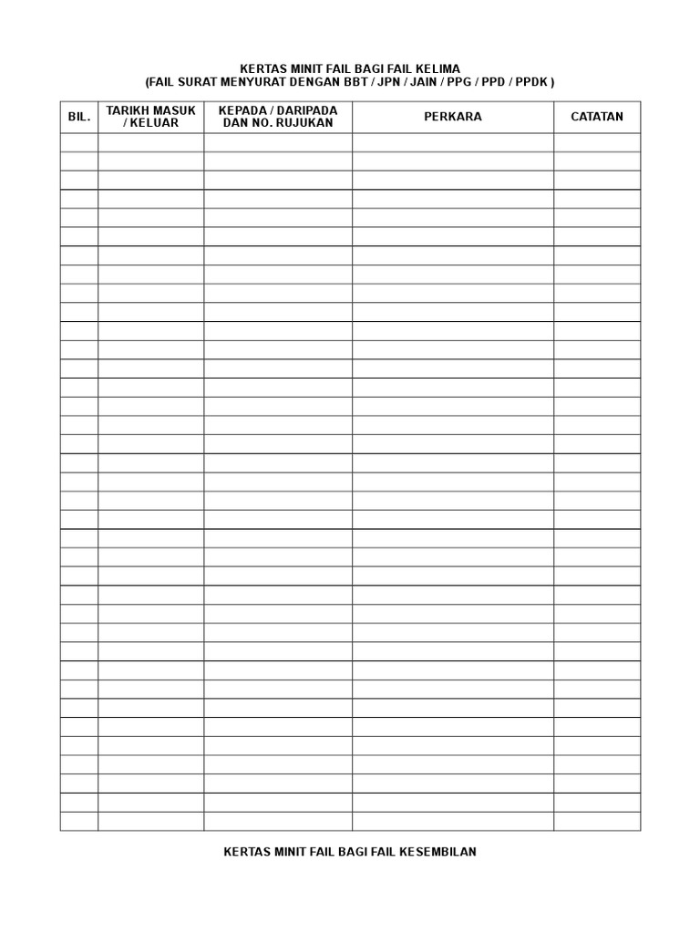 Selepas 10 hingga 15 minit soalan dan catatan jawapan dimasukkan semula ke dalam fail dan diedarkan kepada pasukan lain. 9 Fail Induk telah dilengkapi dengan kertas minit berkaitan surat-menyurat Masukkan fail divider bagi mengasingkan dokumen pentadbir yang berbeza di dalam 10 semua fail. Satu keterangan bertulis yang menyampaikan maklumat yang didapati melalui pemerhatian pendengaran atau perlaksanaan untuk digunakan oleh pihak-pihak yang terbabit dalam menyelesaikan masaalah membuat keputusan dan membuat cadangan.